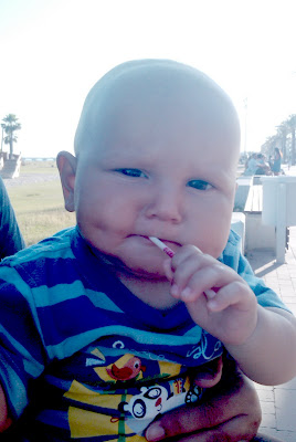 Bueno, pues con 10 meses un día se nos ocurrió ponerlo al pie de las escaleras a ver qué hacía, y sorprendentemente las subió. Al día siguiente va el tío y sube hasta el primer togobán, donde yo lo cogí y se tiró. Emocionado él y emocionada yo. Y ahora ya lo domina del todo. Se sube hasta el timón, parándose de vez en cuando a cotillear a los niños que le van pasando, llega al timón y se pega un buen rato dándole vueltas. A veces se acerca al segundo togobán y su padre o yo si podemos lo pillamos para bajarlo, a veces se nos escapa y vuelve al timón. Otras veces intenta volver pero está el escalón y como no sabe bajar, se queda ahí que parece que se va a tirar pero no lo hace y nos da tiempo de subir y cogerlo. Yo digo que tiene conocimiento y por eso no se tira. Jorge dice que es pura suerte.